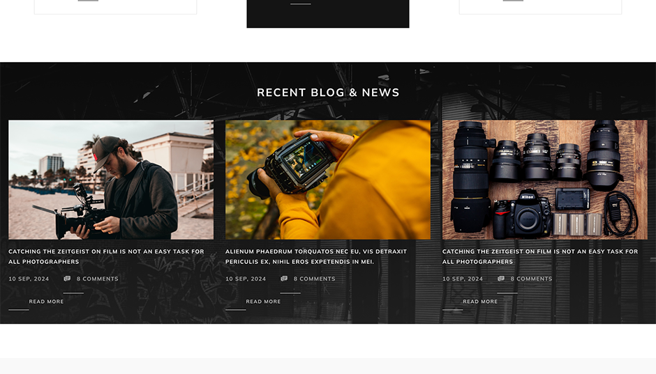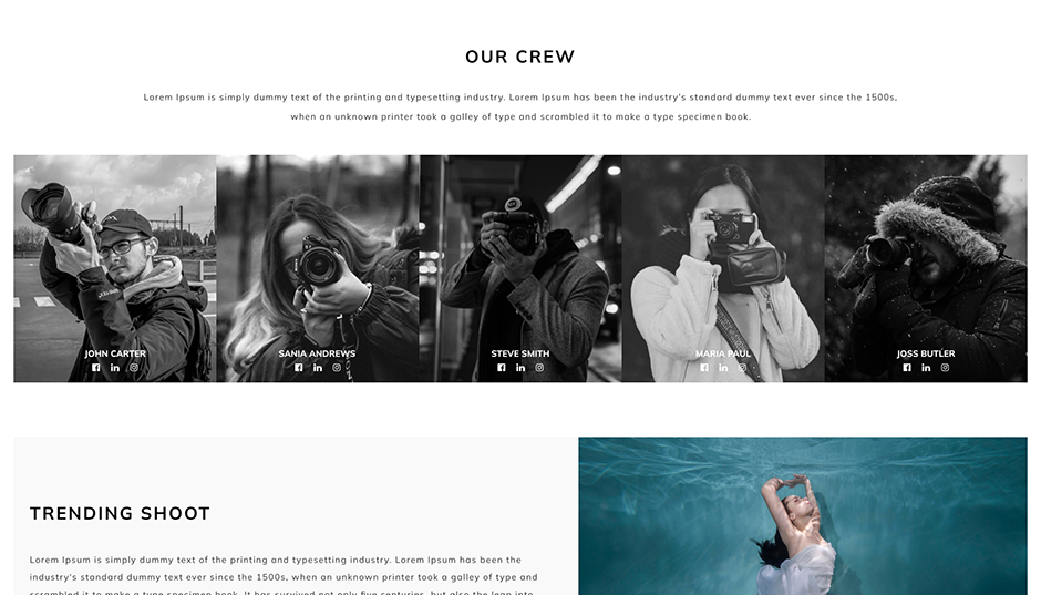 Users can also customise their websites with options for photo printing, framing, and albums, giving a comprehensive view of your offerings. Additionally, you can easily add testimonials, team sections, and call-to-action buttons to drive engagement. With a focus on photography trends and composition tips, this theme inspires both creativity and professionalism, making it the ideal choice for photographers eager to elevate their online presence and attract more clients.