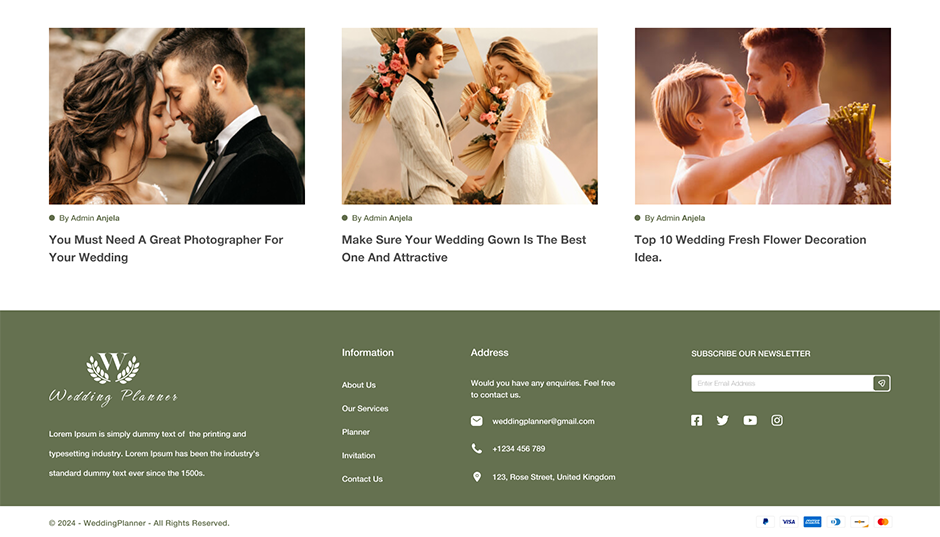 Built with SEO-friendly and optimized code, the Wedding Planner WordPress Theme ensures fast loading times and high search engine visibility key to attracting clients and visitors. The social media integration makes sharing wedding highlights easy, while extensive customization options offer flexibility to align with individual branding. Whether it’s organizing timelines, coordinating entertainment, or managing catering and venues, this theme combines modern aesthetics with practical functionality to create a luxurious wedding planning experience.